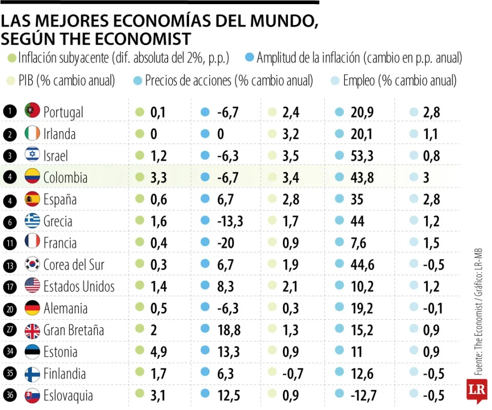 Colombia se ubicó en el cuarto lugar entre 36 países en un ranking internacional que evalúa el desempeño económico anual, según informó el Ministerio de Hacienda. La medición no clasifica a las economías más ricas, sino a aquellas que lograron un mejor balance macroeconómico en un año marcado por la desaceleración global y la incertidumbre financiera.